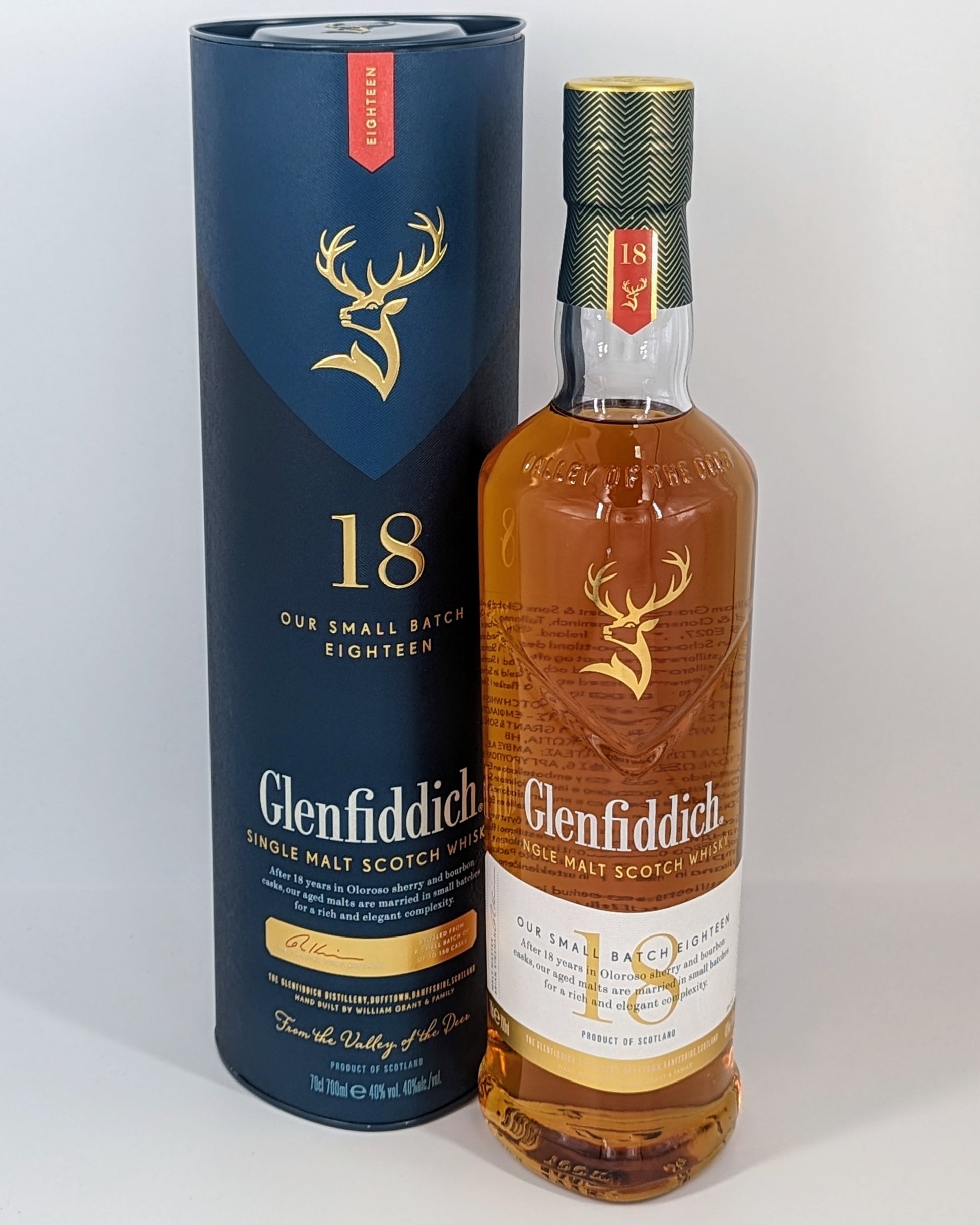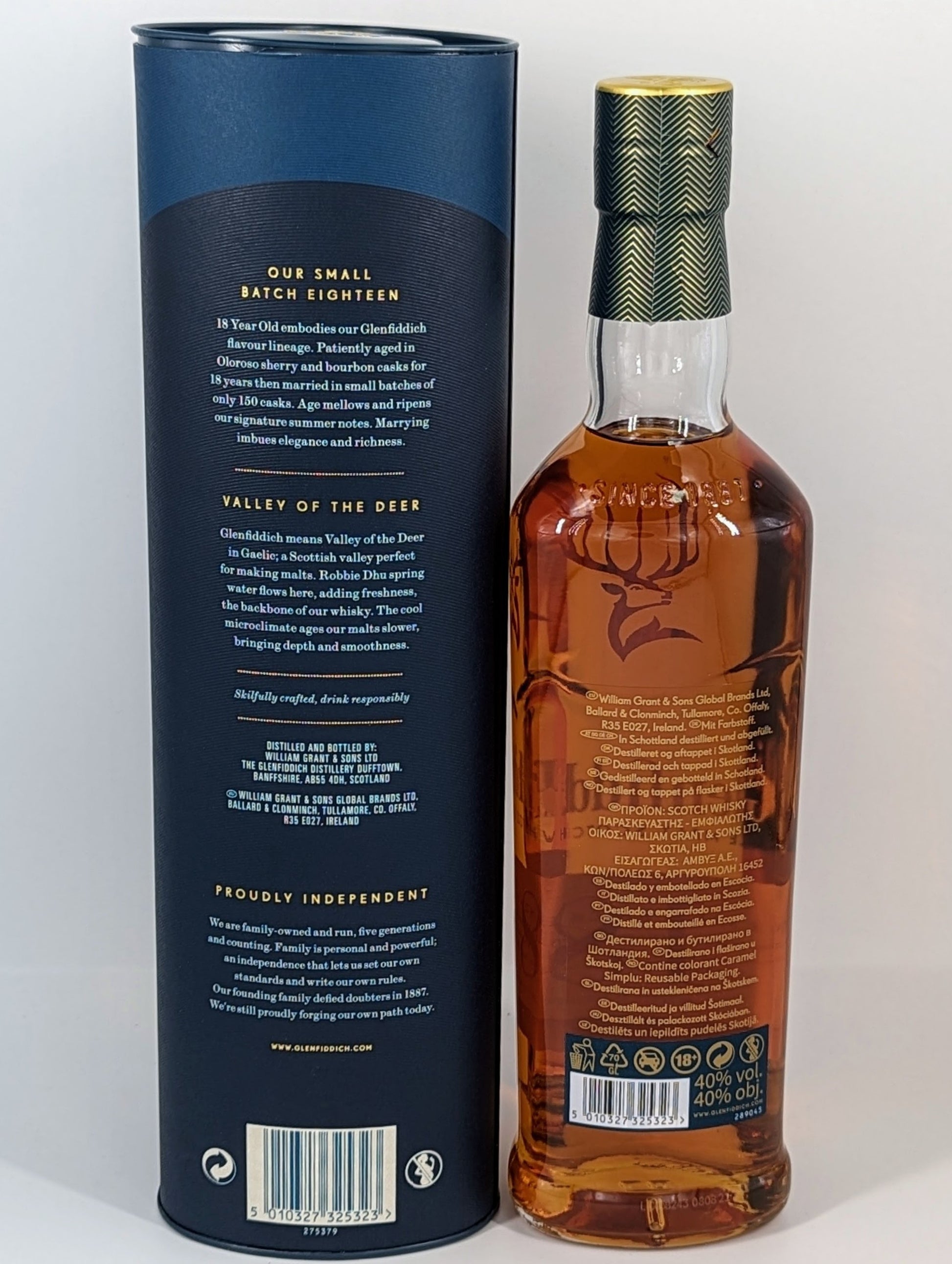 Trên mũi, Glenfiddich 18 Years phát triển hương thơm phong phú của táo chín, quế và gỗ sồi, kèm theo vị ngọt nhẹ nhàng của caramel và trái cây khô. Trên vòm miệng, nó gây ấn tượng với kết cấu mượt mà và hương vị sâu của táo nướng, sô cô la, kẹo bơ cứng và một loại gia vị tinh tế. Hậu vị kéo dài, ấm áp đi kèm với chút gia vị gỗ sồi và rượu sherry ngọt ngào.